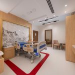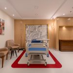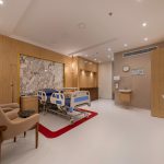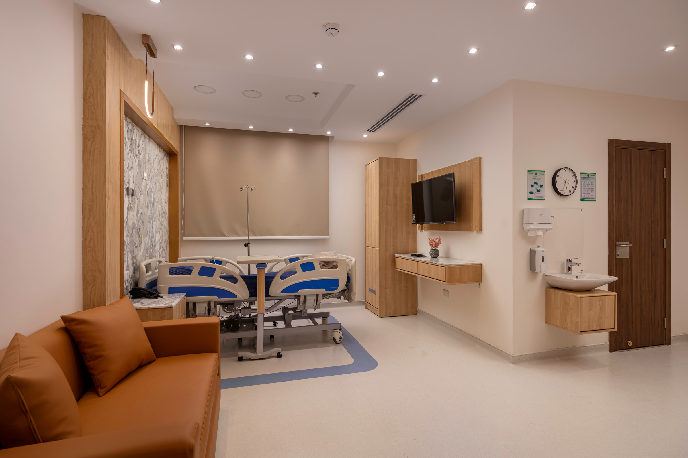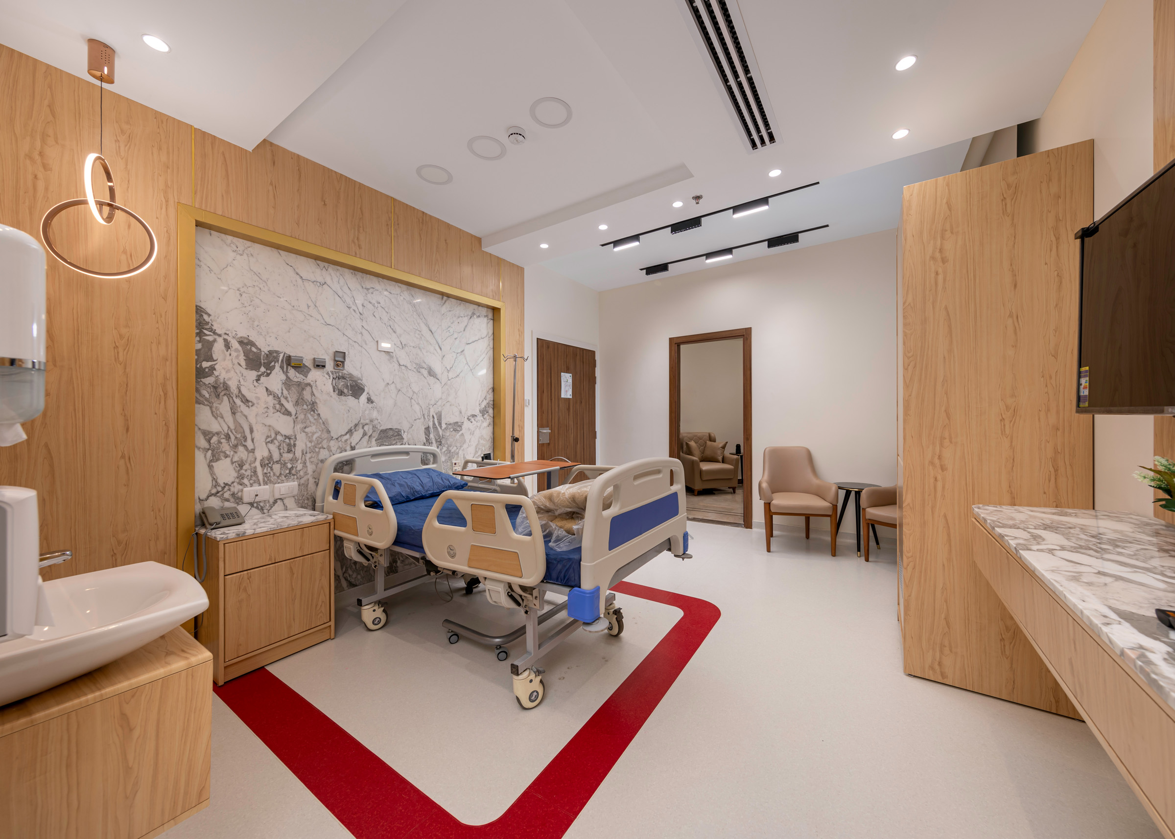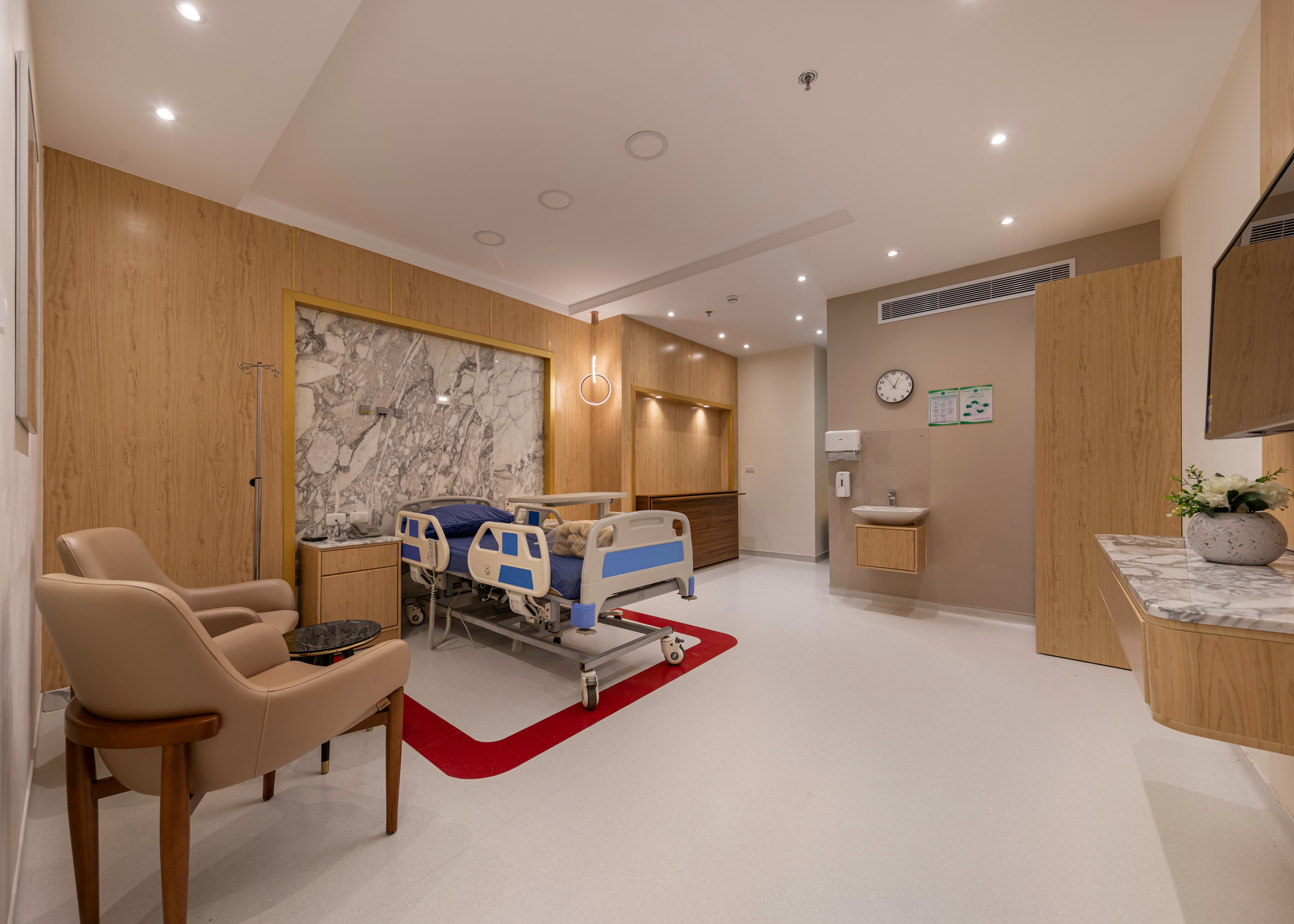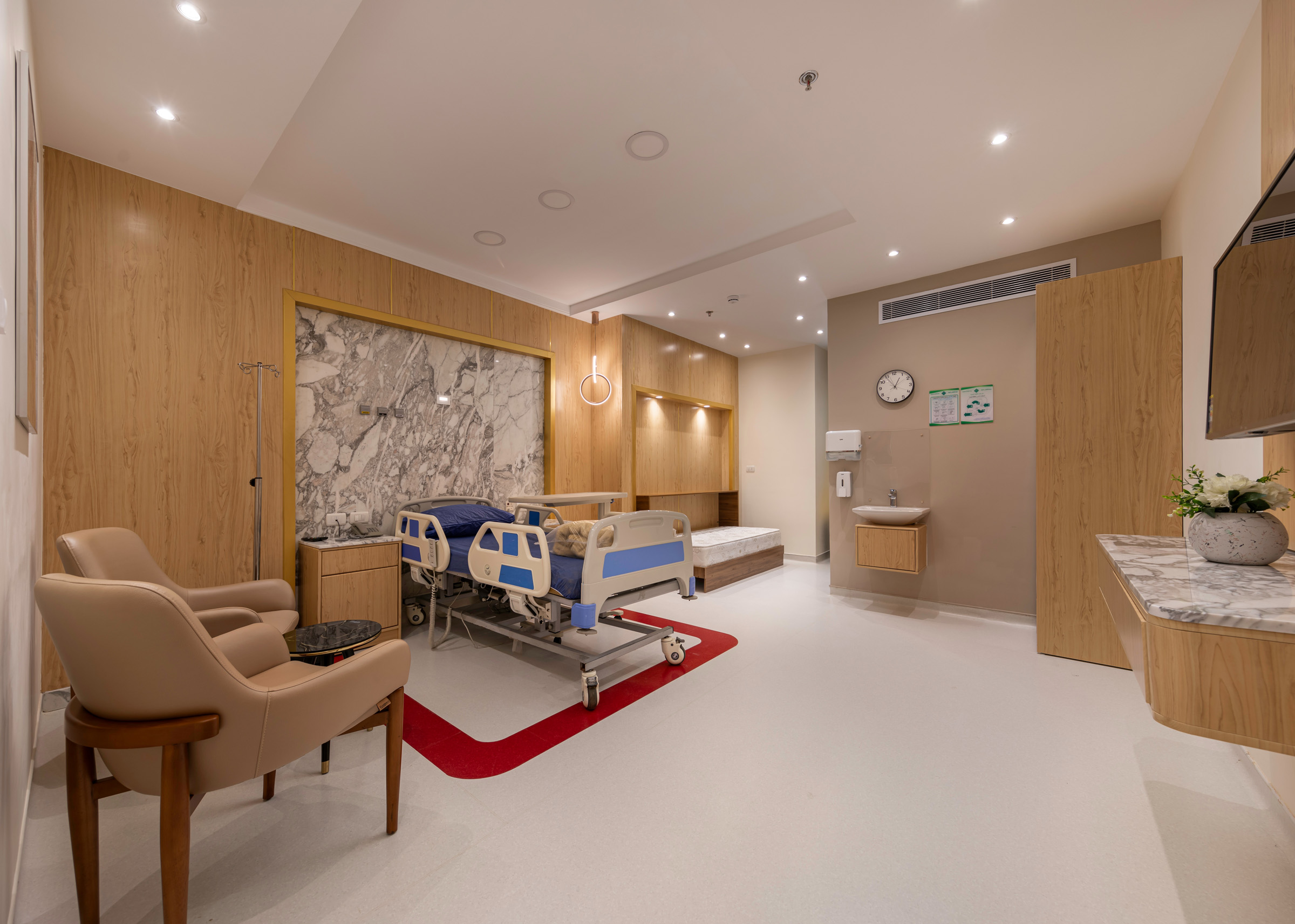 The design of the luxurious patient suites focuses on providing a comfortable and contemporary environment for patients and their families. It blends soothing colors like beige and light wood to create a calm and relaxing atmosphere, with touches of elegant marble for a sophisticated feel. The design is simple and functional, integrating modern furniture and technology to ensure maximum comfort and privacy for patients, while also providing a welcoming space for visitors.