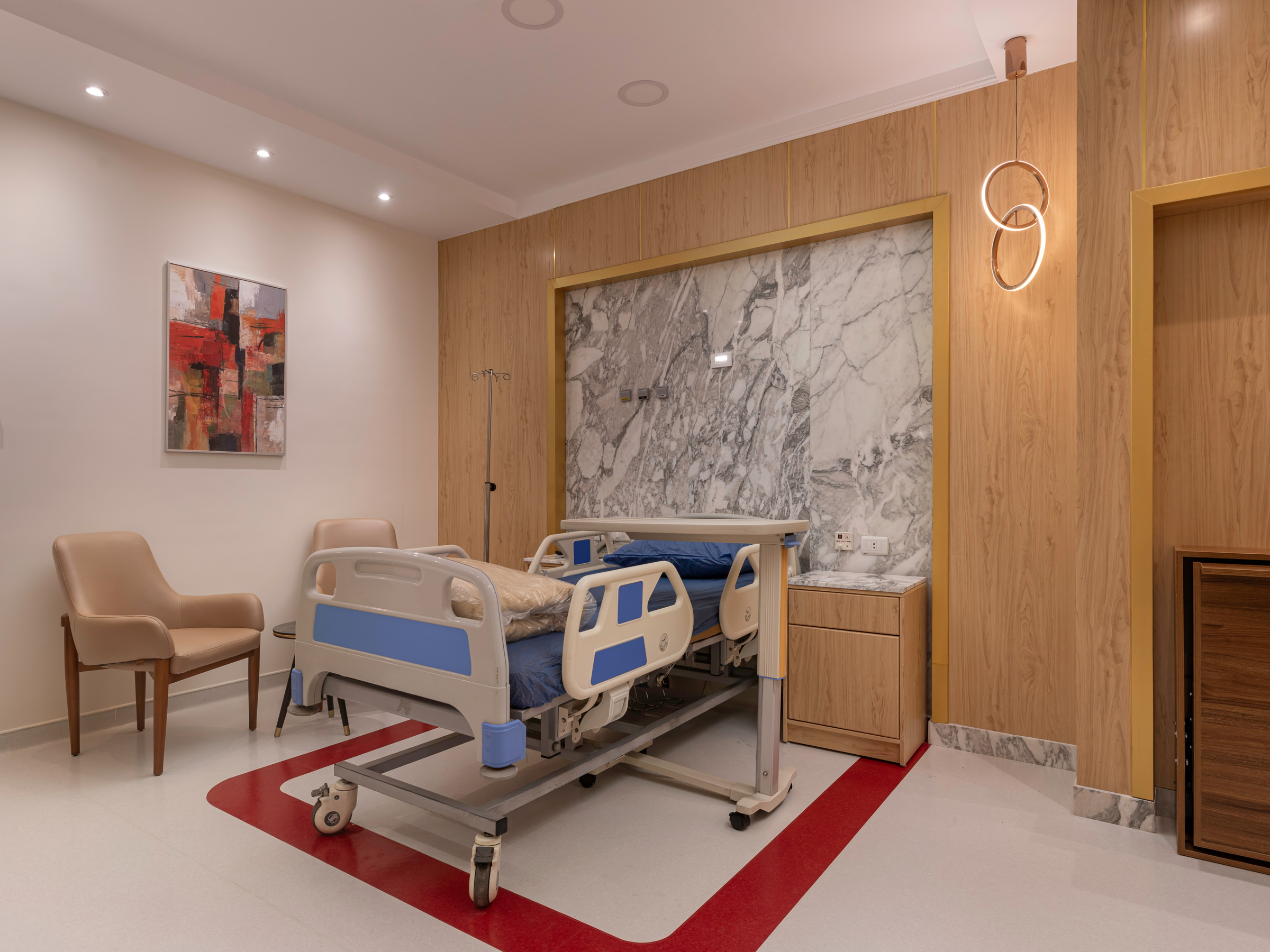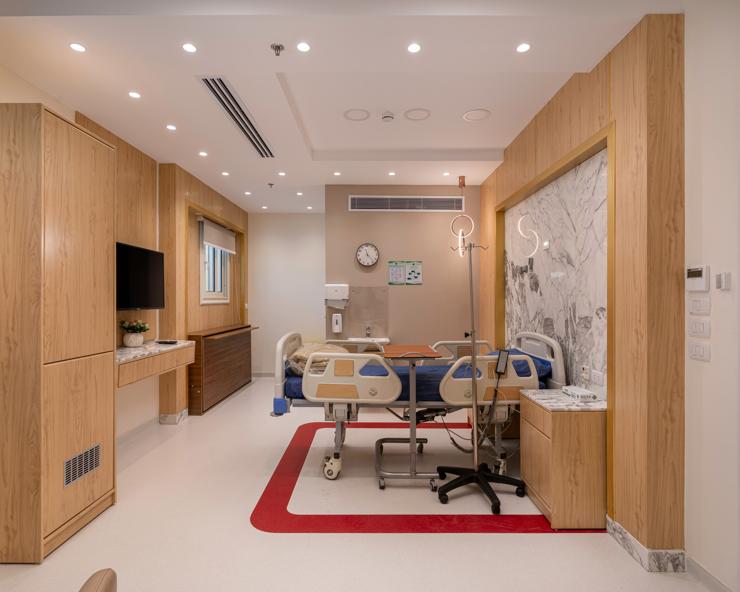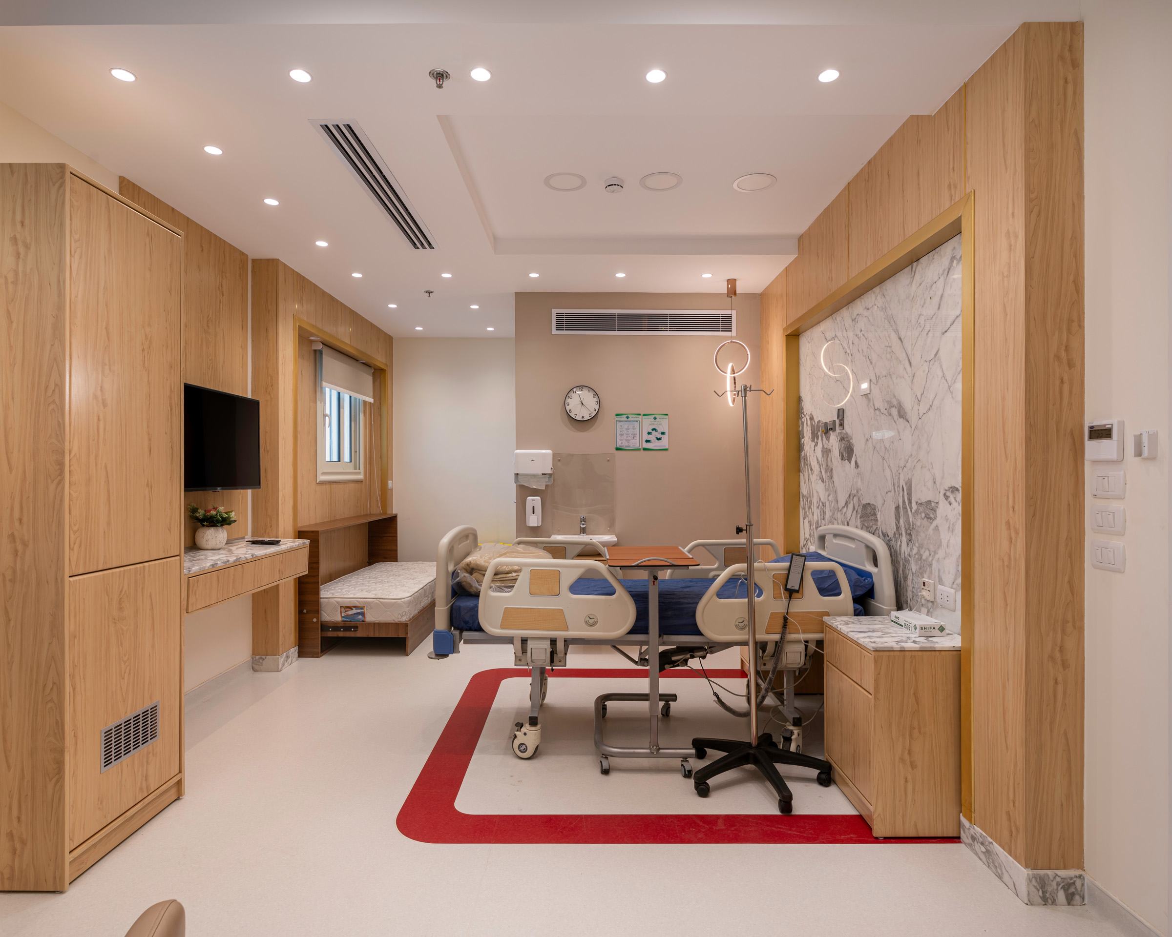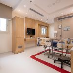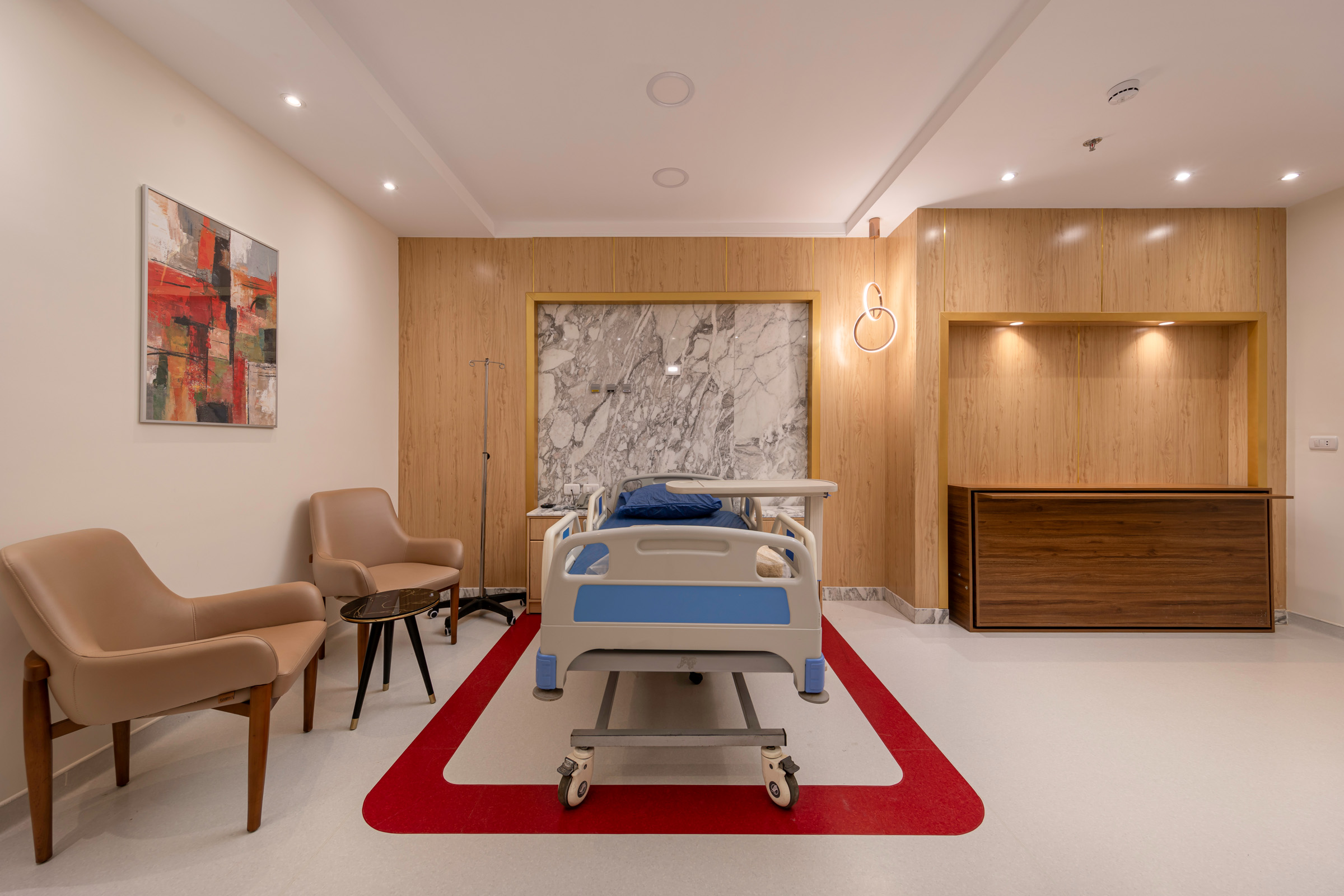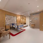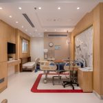 The design of the luxurious patient suites focuses on providing a comfortable and contemporary environment for patients and their families. It blends soothing colors like beige and light wood to create a calm and relaxing atmosphere, with touches of elegant marble for a sophisticated feel. The design is simple and functional, integrating modern furniture and technology to ensure maximum comfort and privacy for patients, while also providing a welcoming space for visitors.