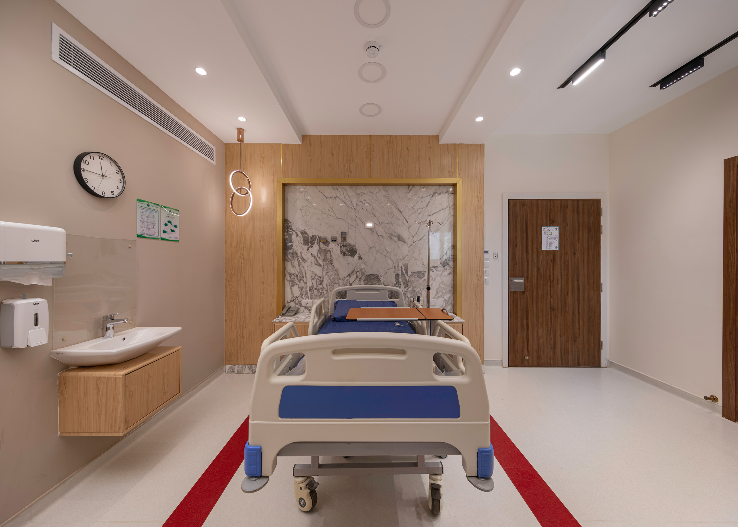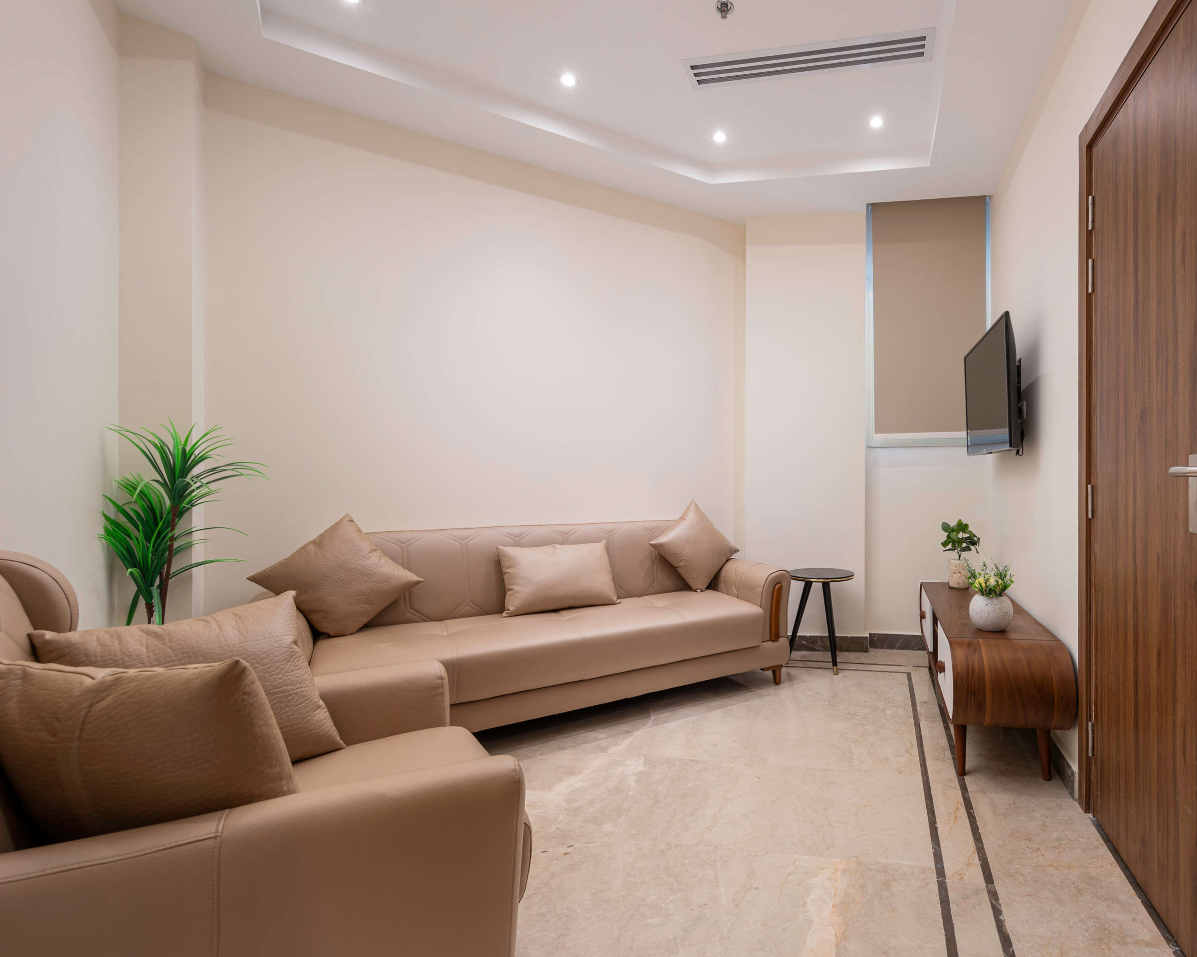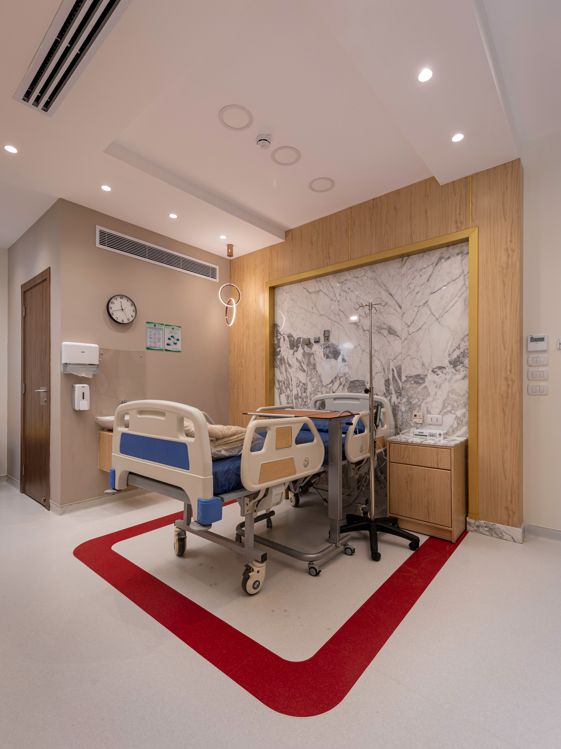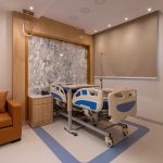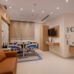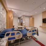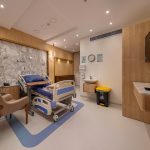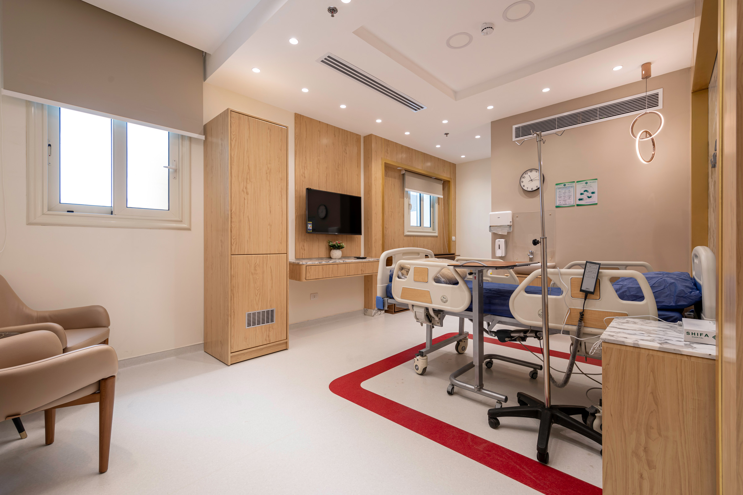 The design of the luxurious patient suites focuses on providing a comfortable and contemporary environment for patients and their families. It blends soothing colors like beige and light wood to create a calm and relaxing atmosphere, with touches of elegant marble for a sophisticated feel. The design is simple and functional, integrating modern furniture and technology to ensure maximum comfort and privacy for patients, while also providing a welcoming space for visitors.