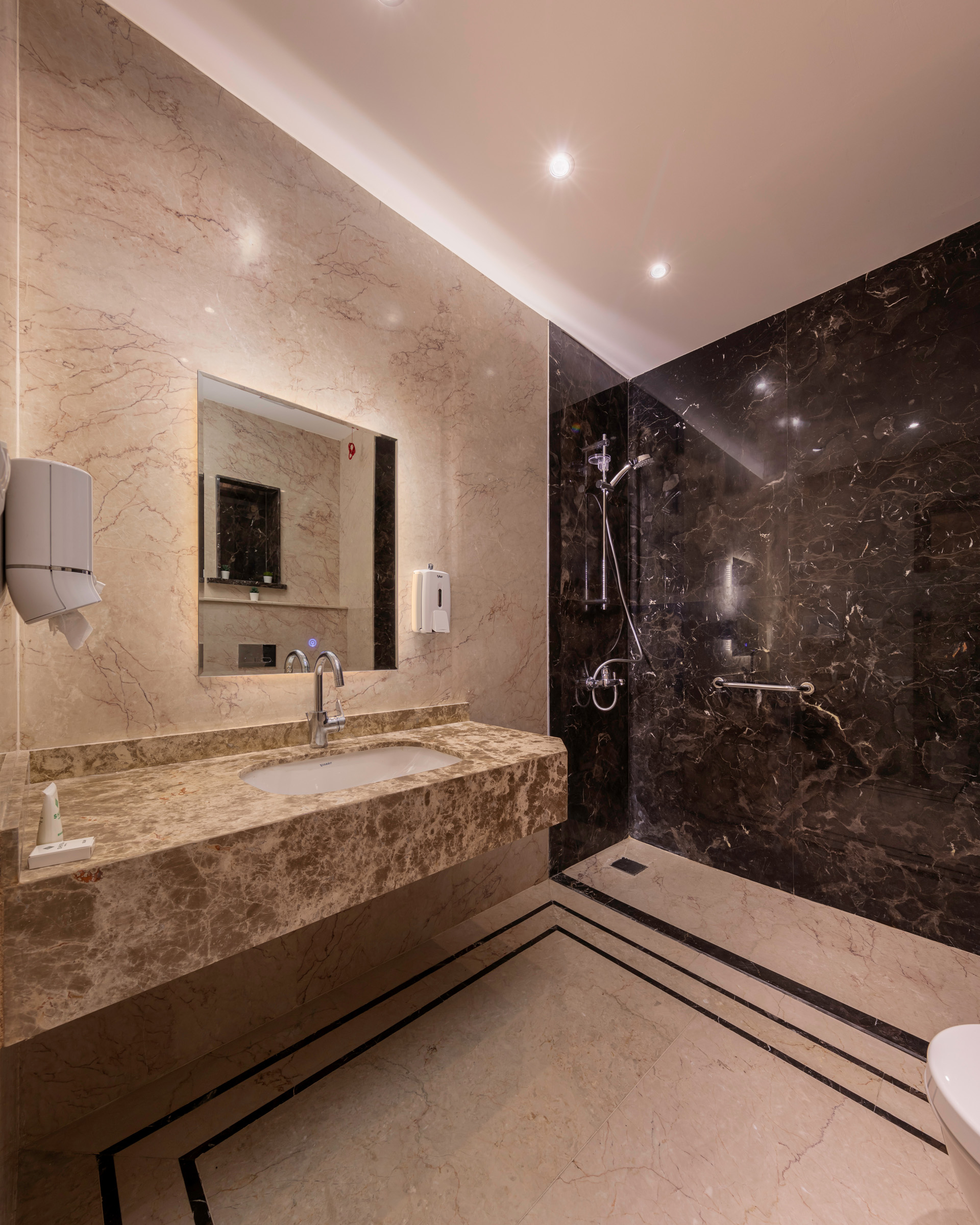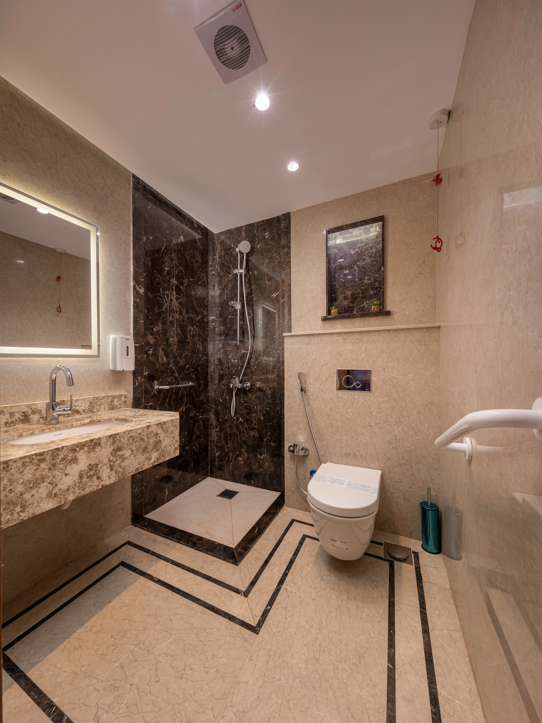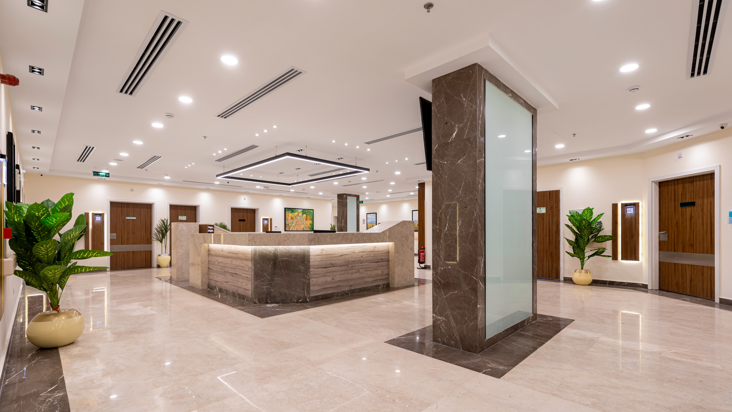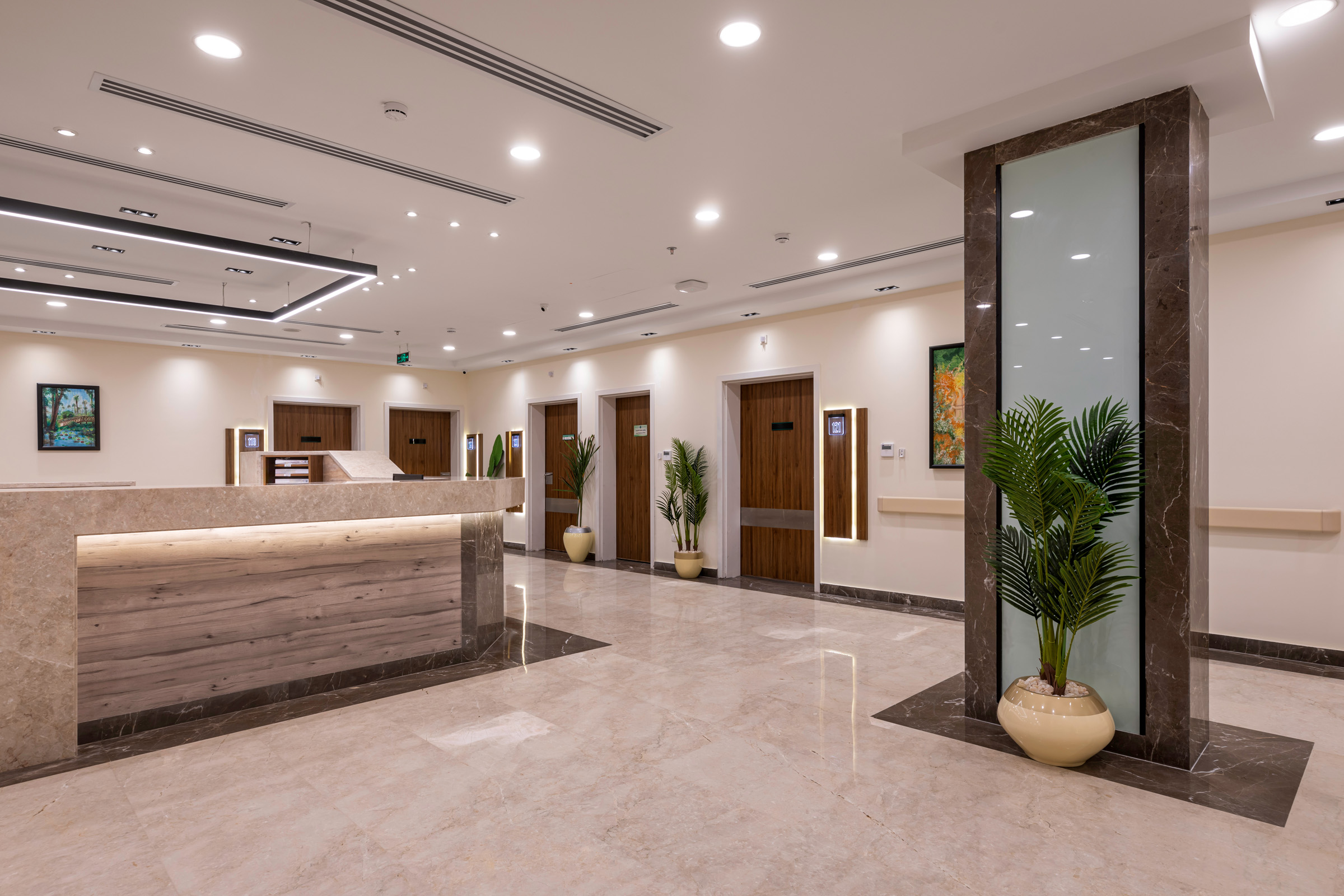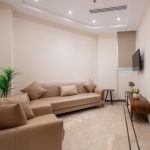 The design of the luxurious patient suites focuses on providing a comfortable and contemporary environment for patients and their families. It blends soothing colors like beige and light wood to create a calm and relaxing atmosphere, with touches of elegant marble for a sophisticated feel. The design is simple and functional, integrating modern furniture and technology to ensure maximum comfort and privacy for patients, while also providing a welcoming space for visitors.