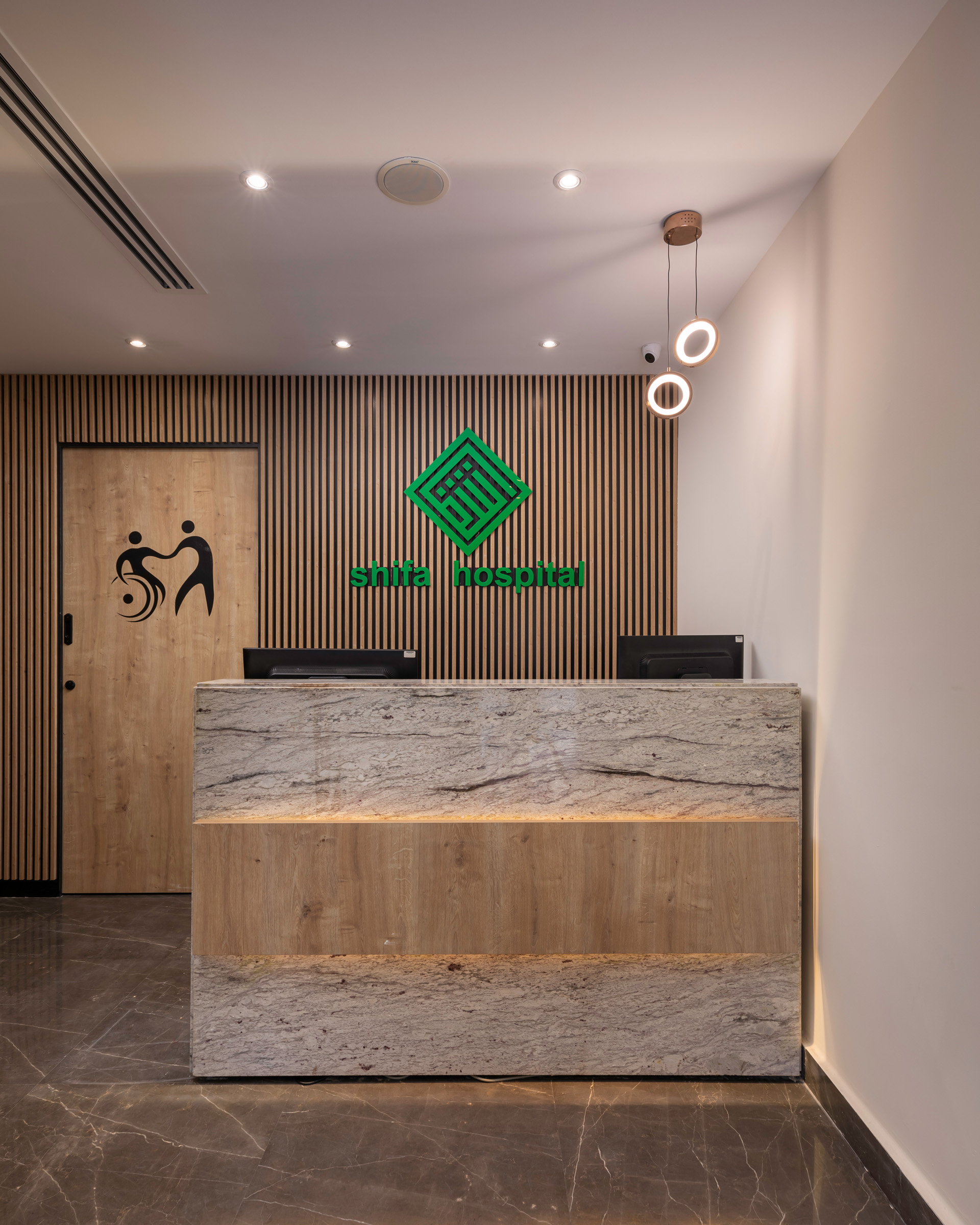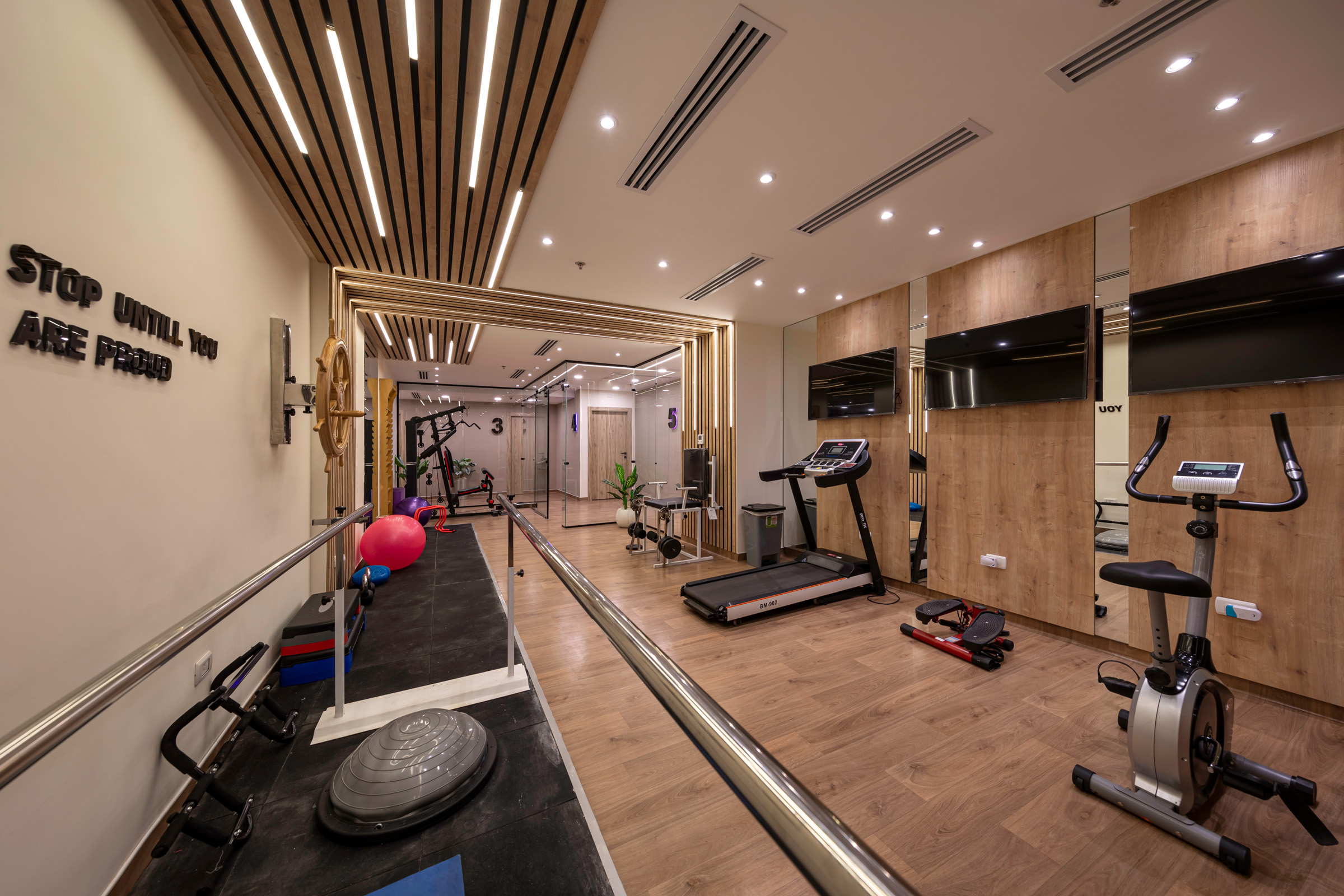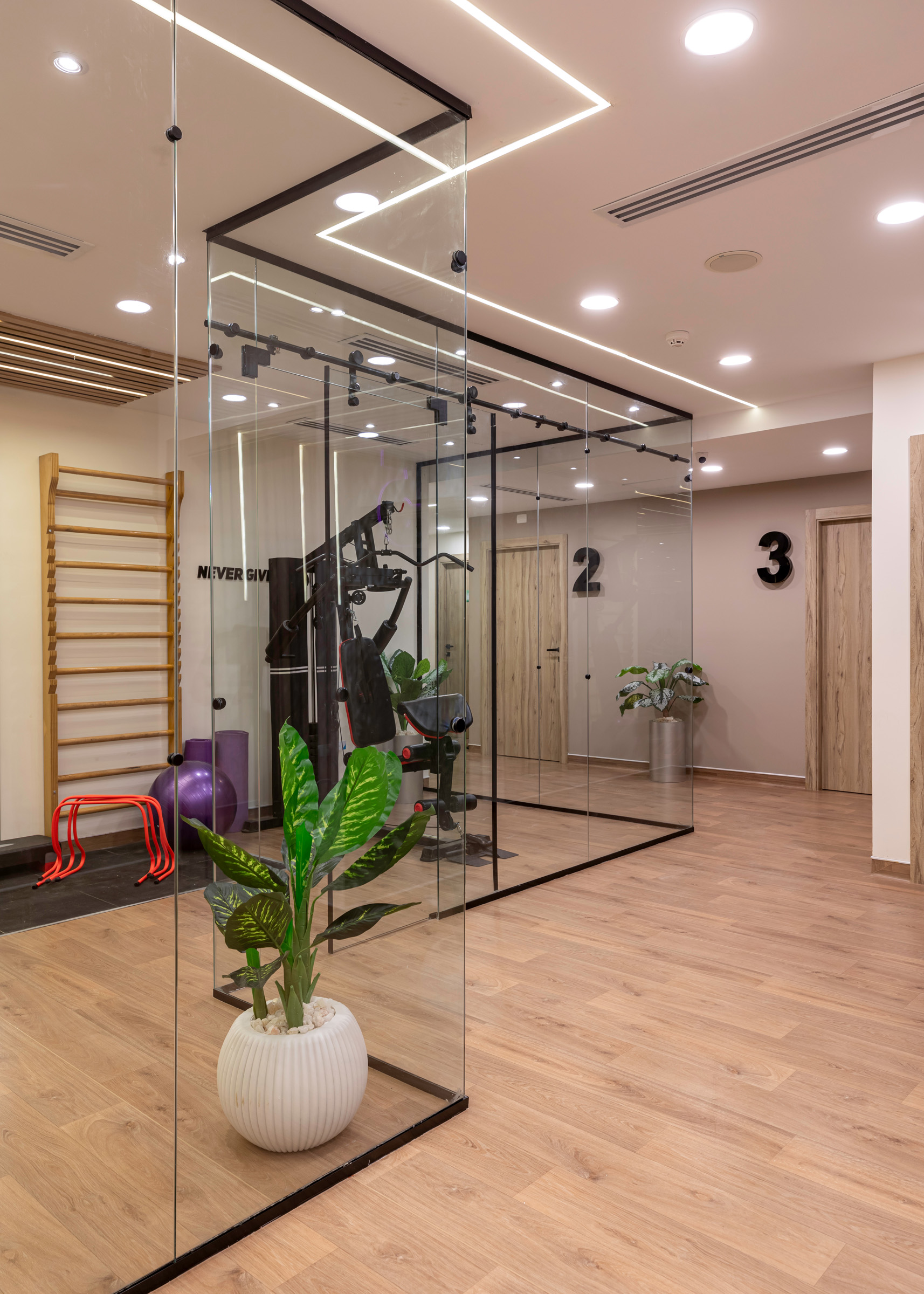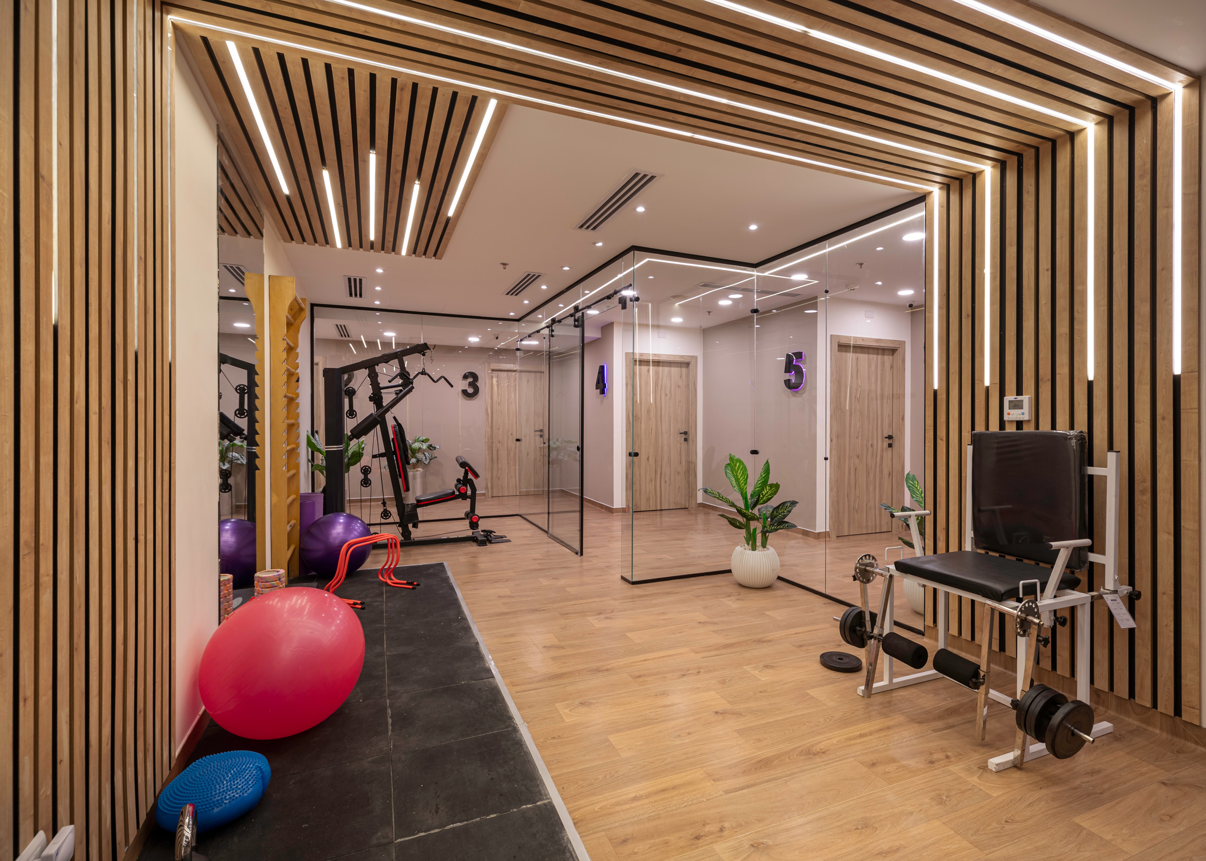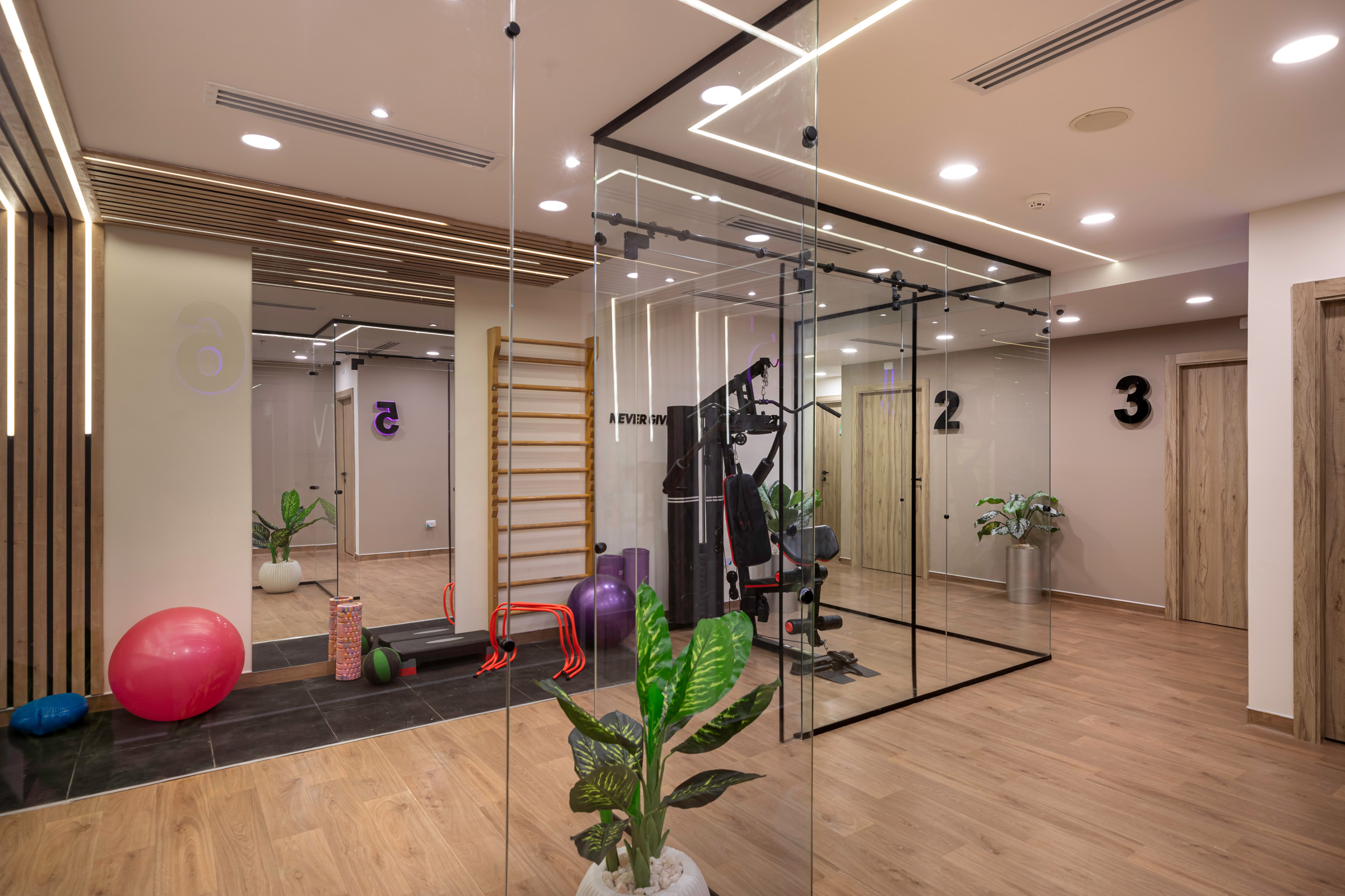 The design of the Physiotherapy Department is focused on creating a motivating and supportive environment for the journey of treatment and recovery. It intelligently blends elegance and functionality, using warm wood textures and modern lighting to create a sense of comfort. The space incorporates transparent glass partitions to enhance the feeling of openness and space. This design allows patients to perform their exercises in a calm and inviting setting, which supports their progress towards healing.