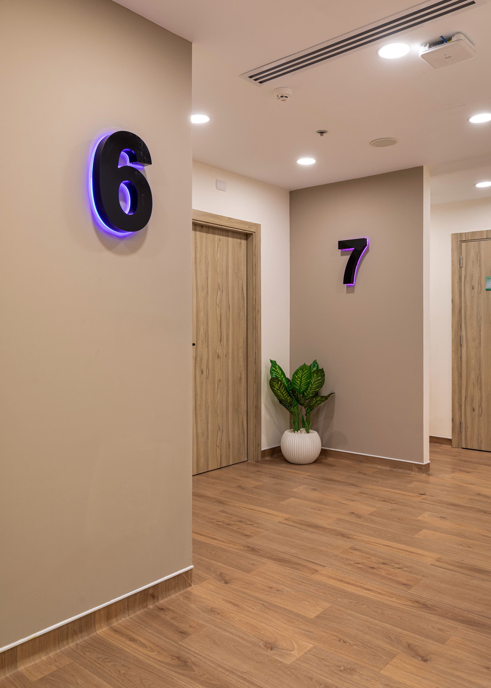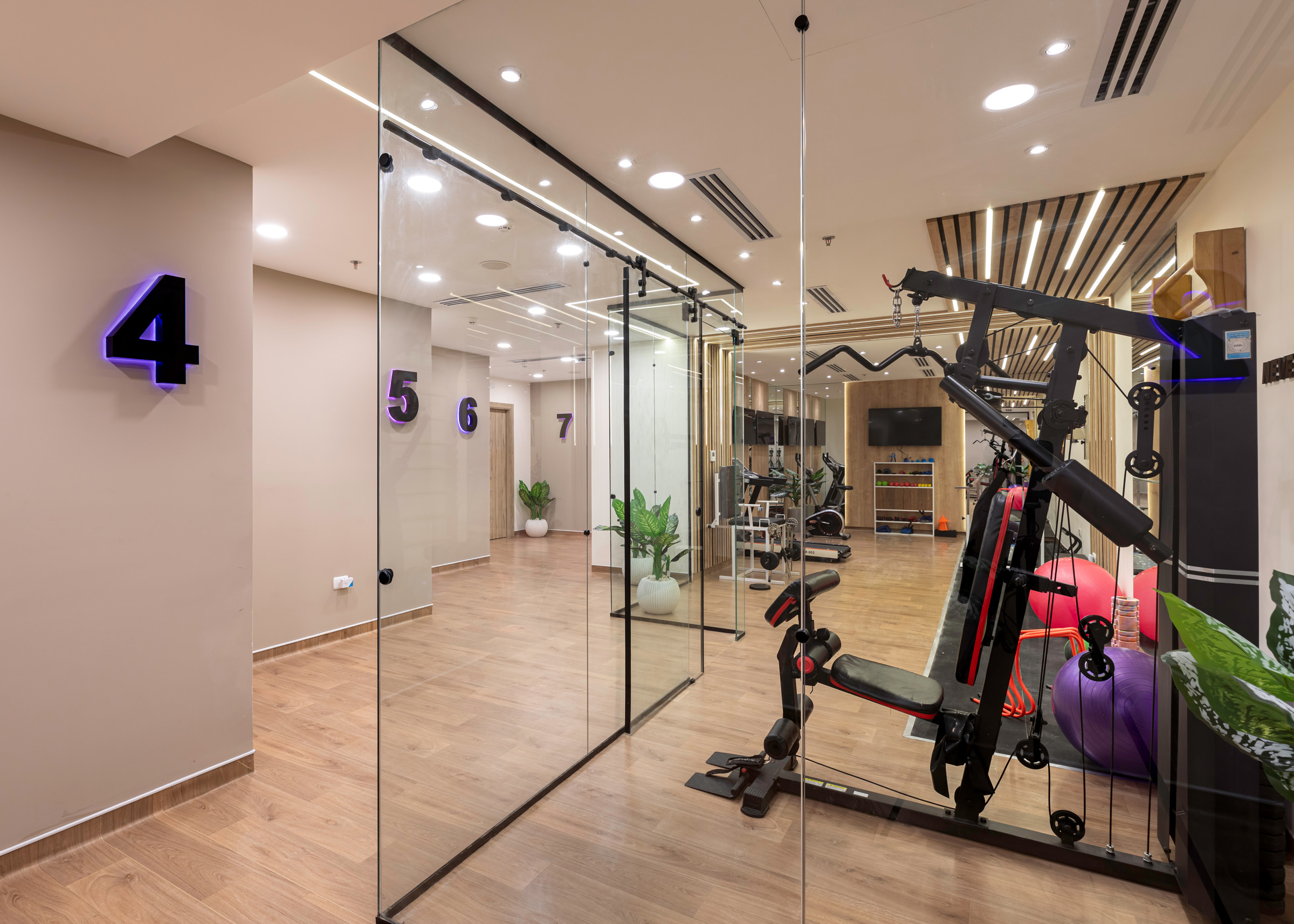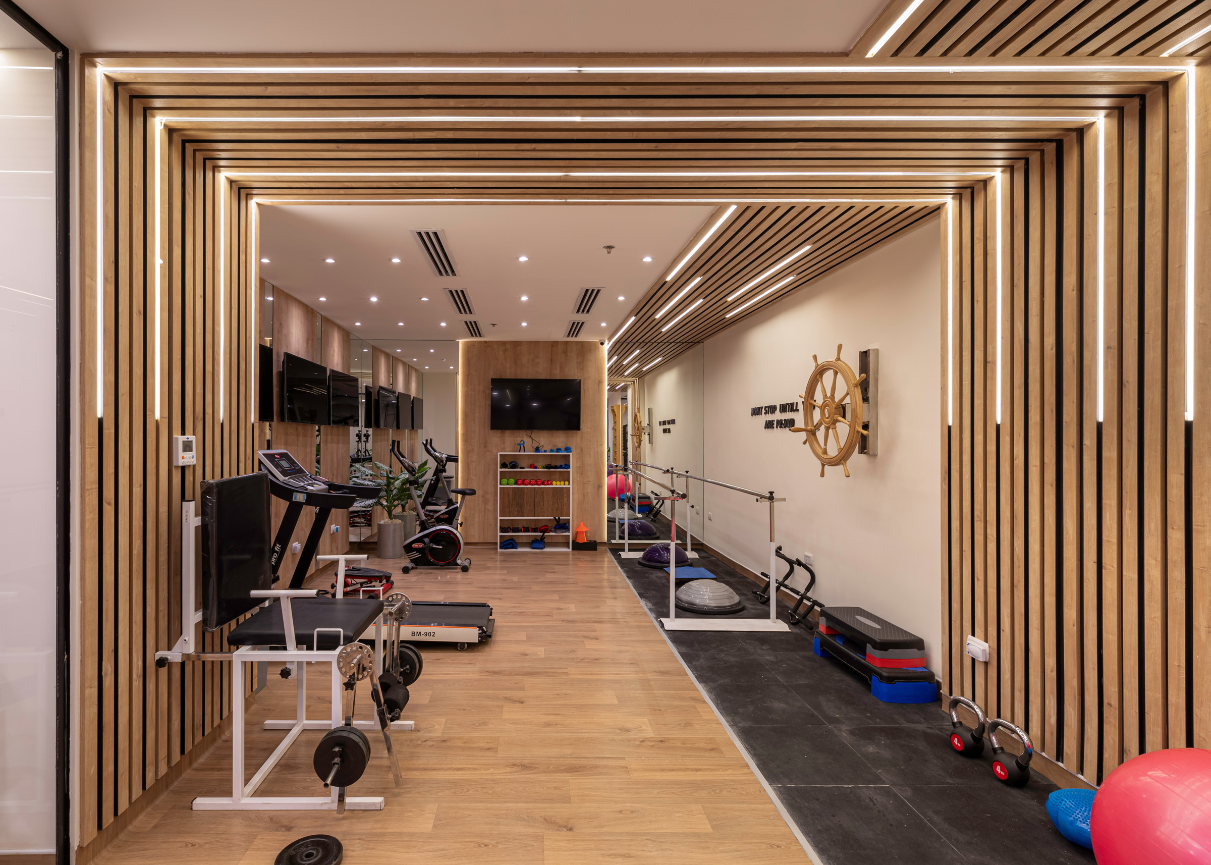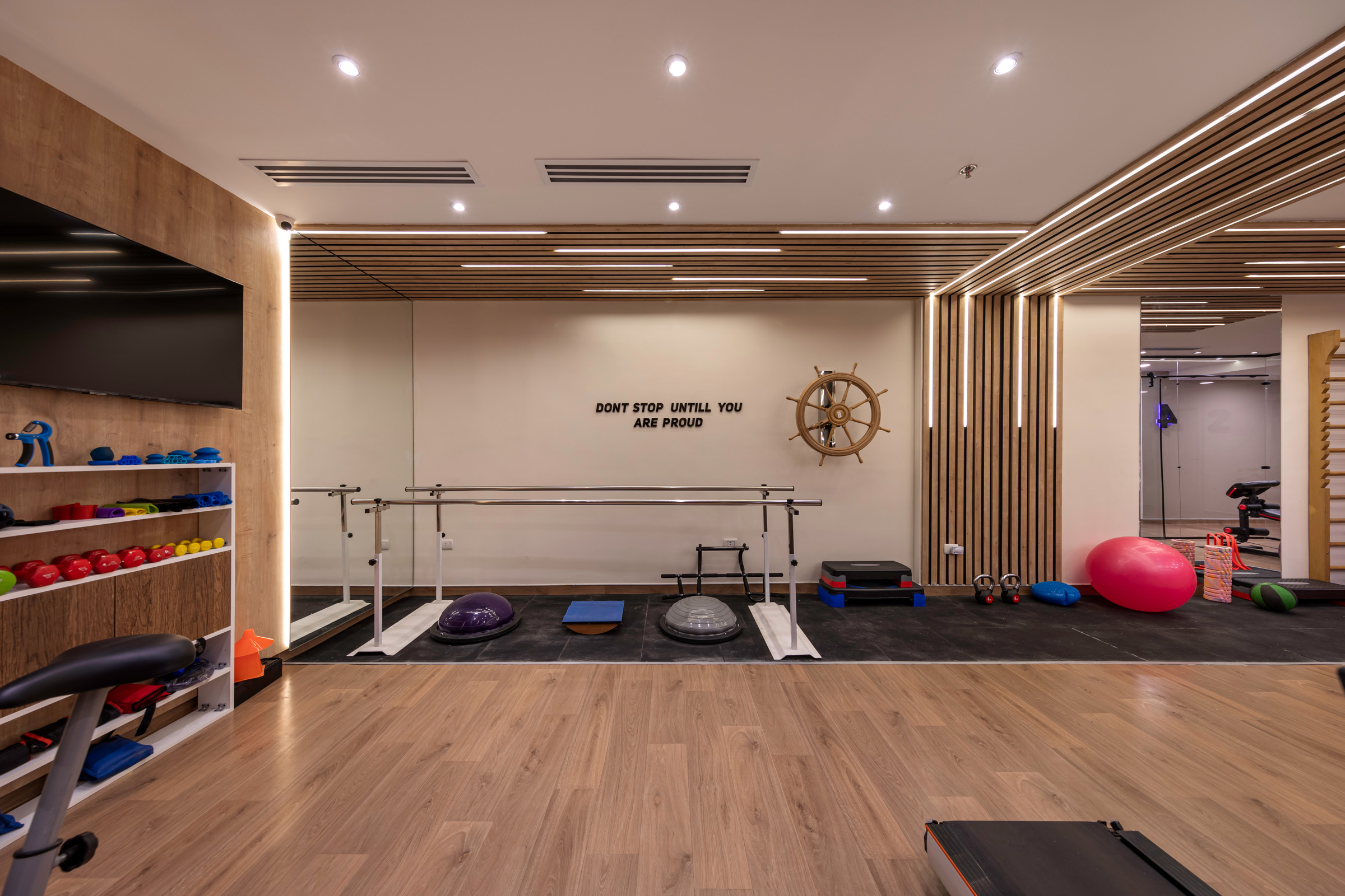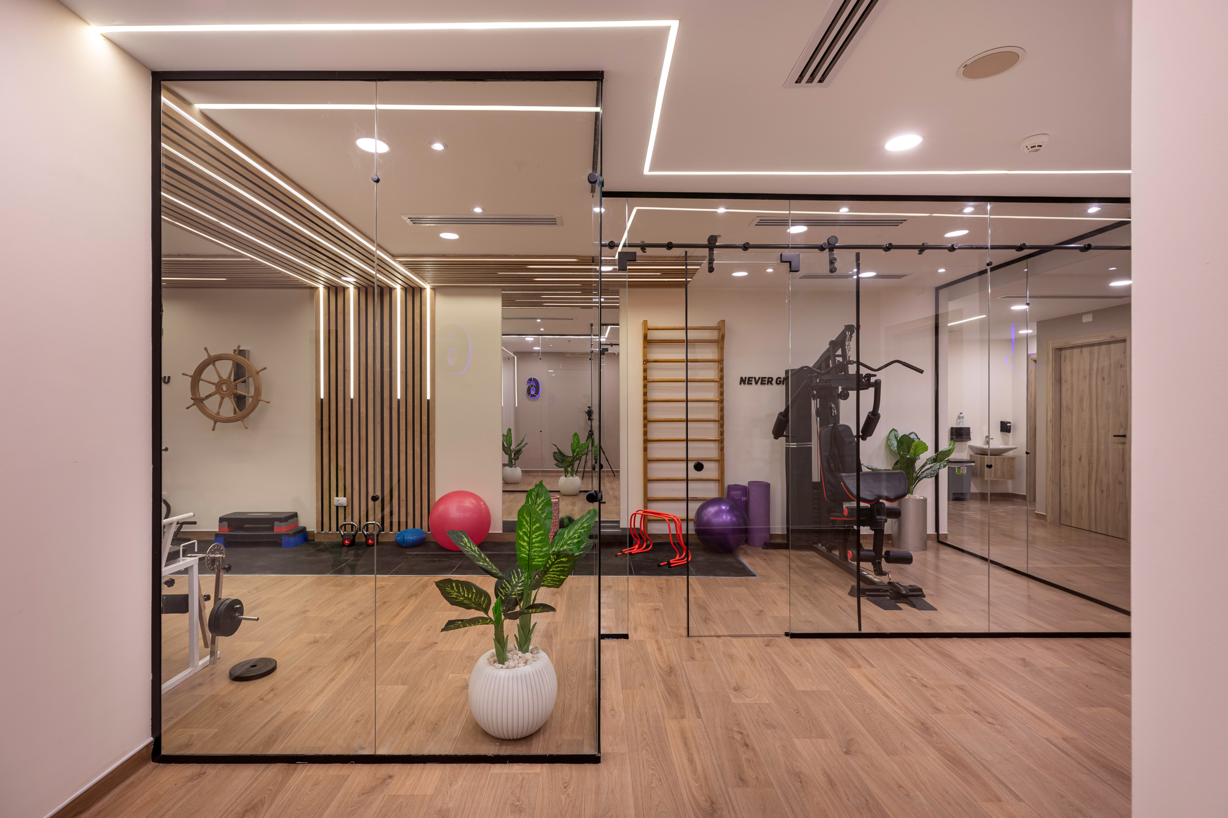The design of the Physiotherapy Department is focused on creating a motivating and supportive environment for the journey of treatment and recovery. It intelligently blends elegance and functionality, using warm wood textures and modern lighting to create a sense of comfort. The space incorporates transparent glass partitions to enhance the feeling of openness and space. This design allows patients to perform their exercises in a calm and inviting setting, which supports their progress towards healing.